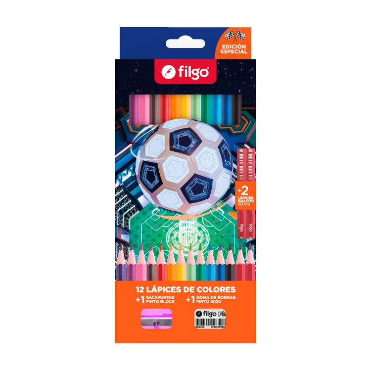 Lapices de Colores Filgo Futbol x 12 + 2 Grafitod + Goma + Sacapuntas Art.PN201-E12-FTSY4.